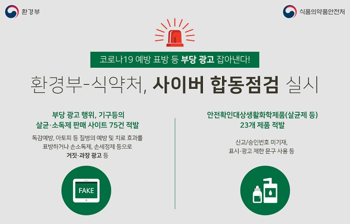 식품의약품안전처와 환경부는 지난 4월 22일 부터 5월7일까지 코로나19 바이러스 제거 효능이 있다고 부당 광고한 살균소독제 838개 사이트를 대상으로 불법행위에 대한 사이버 합동점검을 실시한 결과, 98건과 42개 제품을 적발하고 해당 사이트 차단 및 행정처분을 요청했습니다.