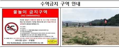 특히, 위험구역과 금지구역*은 유속이 빨라 급류를 형성하고, 바닥이 갑자기 깊어지는 곳이 있어 물놀이 장소로는 매우 위험하다.