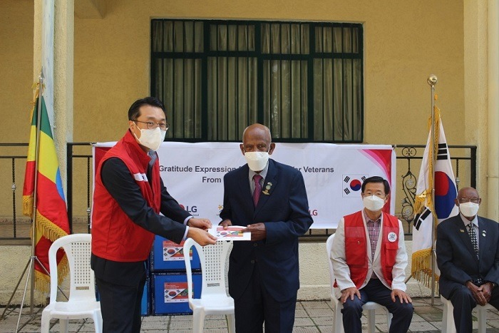 LG전자는 현지시간 23일 에티오피아의 수도 아디스아바바에 위치한 에티오피아 한국전 참전용사협회에서 생존 참전용사 100여 명에게 생활지원금, 손소독제 등을 전달했다. 참전용사와 가족이 코로나를 이겨내는 데 조금이나마 보탬이 되고자 행사를 마련했다.