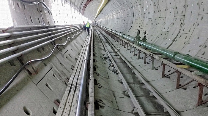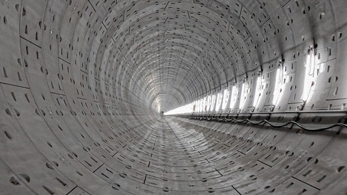 쉴드TBM 터널공법(Shield Tunnel Boring Machine)은 원통형 커터 날을 회전시켜 암반을 잘게 부숴 수평으로 굴진한 후 공장에서 제작한 콘크리트 구조물(세그먼트)을 조립하여 터널을 시공하는 방법으로 직경 7.66m, 길이 10.7m, 무게 392톤의 초대형 쉴드TBM 장비가 사용되었다.