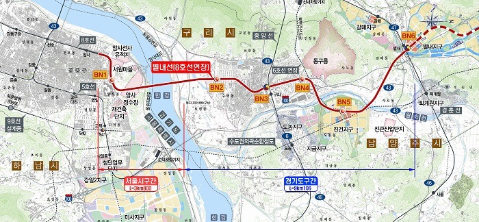 도시철도 8호선 연장(별내선)구간은 현재 운행 중인 지하철 8호선 종점역인 암사역(강동구 암사동)을 시작으로 한강 하부를 통과하여 구리시 구간을 지나 남양주시 별내읍까지 12.906㎞에 구리역(경의중앙선), 별내역(경춘선) 등 환승정거장 2개소를 포함한 정거장 6개소가 설치되며, 총 사업비는 1조 3,403억 원이다.
