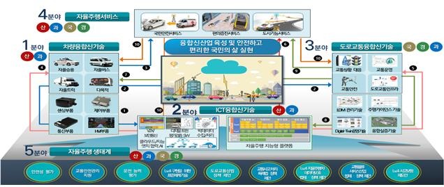 경찰청은 도로교통융합 신기술, 자율주행 생태계의 2개 전략분야, 9개 세부과제에서 LG유플러스, 네이버시스템㈜, ㈜차지인, 도로교통공단, 한국전자기술연구원, 한양대 등 중소·중견기업 32개, 대기업 1개, 국책연구기관 8개, 대학 17개 등 총 74개 기관에 석·박사 327명을 포함, 전체 687명의 연구인력이 참여하여 교통안전과 소통 확보를 위해 도로교통법 등 법제도 전반을 검토하고, 자율주행차의 운전능력 사전검증 및 운행 지원체계와 교통사고 분석기술 개발 등을 추진할 예정이다.