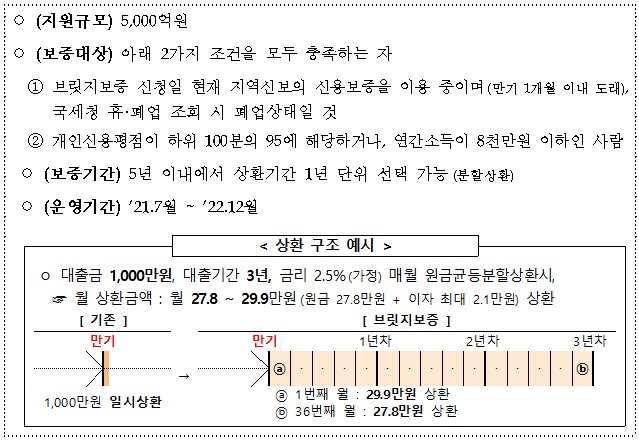노용석 중기부 글로벌성장정책관은 “그동안 지역신보의 신용보증 기간 중 폐업한 소상공인이 상환 여력이 없는 경우 신용도판단정보에 등재돼 재기 기회가 상실될 우려가 있었다”며 “브릿지보증을 통해 폐업한 사람에게도 제도권 내 정책금융을 공급해 정상 상환과 재창업을 유도하고 코로나19로 어려움을 겪고 있는 소상공인들의 위기 극복에 보탬이 되기를 바란다”고 밝혔다.