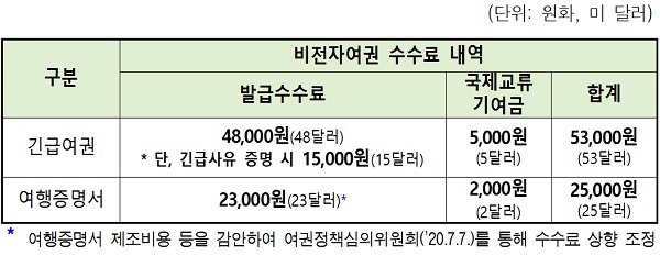 수수료도 여행목적이 신청인의 친족 사망 또는 중대한 질병·부상 등의 사유인 경우 증명서류 사전 또는 사후(6개월 내) 제출할 때 5만 3000원에서 2만 원으로 감면된다.