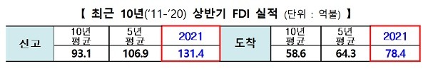 올해 상반기 외국인직접투자(FDI)는 신고기준으로 전년 동기 대비 71.5% 증가한 131억 4000만 달러, 도착기준은 57.3% 증가한 78억 4000만 달러를 기록했다. 이는 2018년에 이어 신고·도착기준 모두 상반기 역대 2위 실적이다.