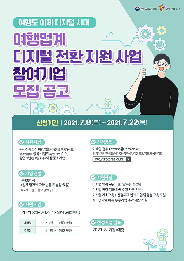 한편, 관광산업 이해도가 높고 최근 3년 이내에 디지털 전환 지원 분야 프로그램과 유사한 과제를 수행해 본 적이 있는 기업이나 기관을 대상으로 ‘여행사별 디지털 전환 과제 수행을 위한 서비스 제공 기업’도 오는 22일까지 모집한다.