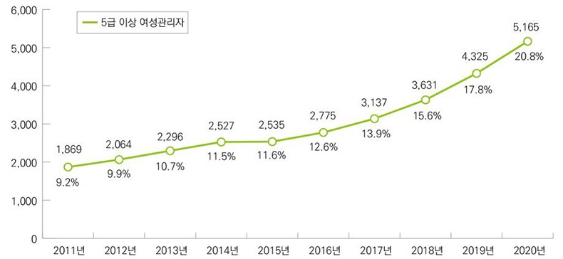 특히 지방자치단체의 5급 이상 여성관리자 비율은 2019년 17.8% 대비 3%p 증가한 20.8%로 나타났는데, 2011년 1869명에서 꾸준히 증가해 2020년에 5165명을 기록하며 10년 만에 약 2.7배 증가했다.