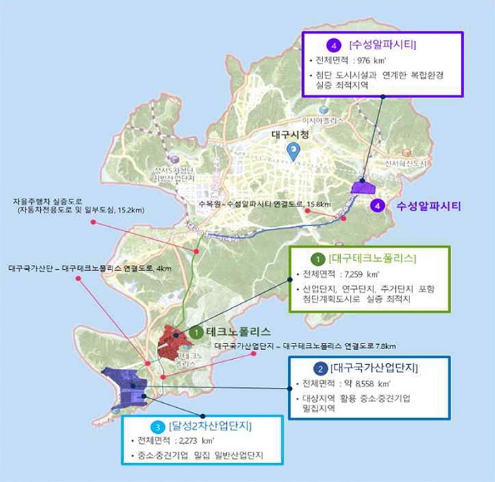 자율주행 컨트롤타워 역할을 수행하는 자율주행 융합지원센터 내 디지털 융합지원 센터와 기업지원센터를 마련해 데이터 기반 자율주행 기술과 부품, 서비스 개발을 지원하며, 도심지 실증을 위해 수성알파시티, 테크노폴리스, 대구국가산단, 달성2차 일반산업단지의 도로, 교차로 등에 도심지 실증환경을 조성해 다양한 환경에서의 기술개발과 비즈니스 모델 발굴을 지원한다.