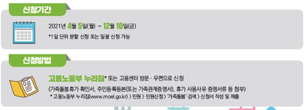 황보국 고용부 통합고용정책국장은 “최근 수도권 거리두기 격상 등에 대응해 많은 근로자들이 경제적 부담을 덜고 가족돌봄휴가를 사용할 수 있도록 제도안내와 지원에 최선을 다하겠다”고 밝혔다.