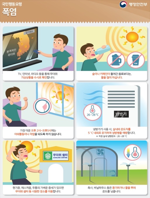 김희겸 행정안전부 재난안전관리본부장은 “폭염 시에는 야외활동을 최대한 자제하고, 건설현장 및 논·밭 등 실외 작업장에서는 폭염안전수칙을 항상 준수하여 폭염 피해가 최소화되도록 적극 협조해 주시길 바란다.”고 당부하였다.