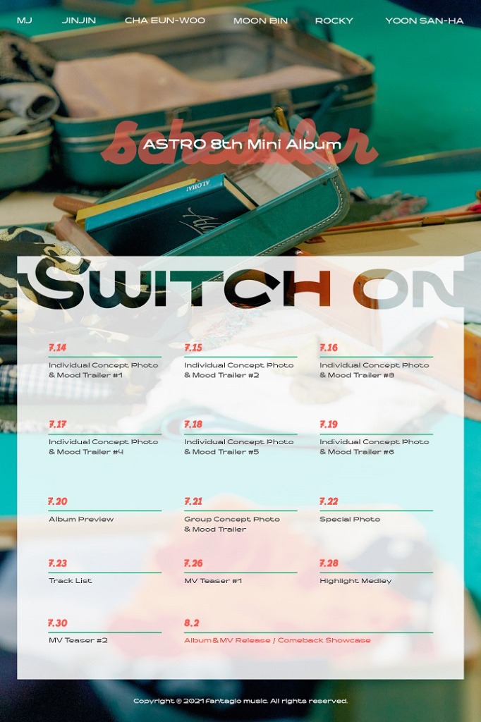 13일 자정 아스트로(MJ, 진진, 차은우, 문빈, 라키, 윤산하) 공식 SNS 채널을 통해 미니 8집 ‘SWITCH ON’(스위치 온)의 스케줄러 이미지가 공개됐다.