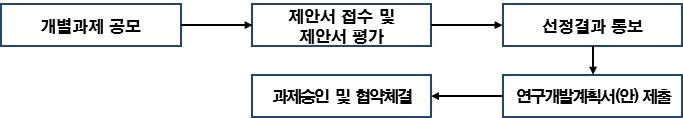 각 공모는 8월부터 서면평가, 발표평가 및 종합평가를 거쳐 9월에 선정된다. 사업관리자(PM)는 소정의 절차를 거쳐 임용되어 해당 프로그램 관련 기획․관리 업무를 수행하며, 개별과제는 12월 해당 기관과의 협약 체결하고 선정된 연구기관은 2~5년 동안 기술개발을 추진하게 된다.