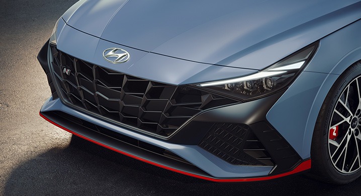 아반떼 N의 전면부는 기본차 대비 블랙트림부를 확대하고 범퍼 하단부를 낮게 가로지르는 립 스포일러가 고성능의 안정적인 스탠스를 구현해준다.