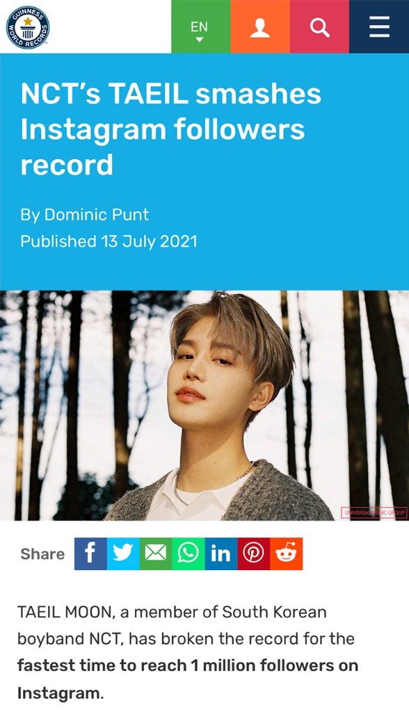 이에 기네스 월드 레코드는 13일(현지시간) 공식 홈페이지를 통해 “NCT 태일이 인스타그램 팔로워 기록을 경신했다“며 “태일이 인스타그램 첫 게시물 게재 후 1시간 45분 만에 팔로워 100만명을 돌파했다”고 전했다.