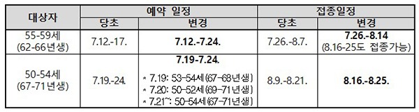55세~59세 연령층의 접종은 26일부터 8월 14일까지 시행하며 50~54세 연령층 접종기간인 8월 16일부터 25일 사이에도 예약 후 접종이 가능하다.