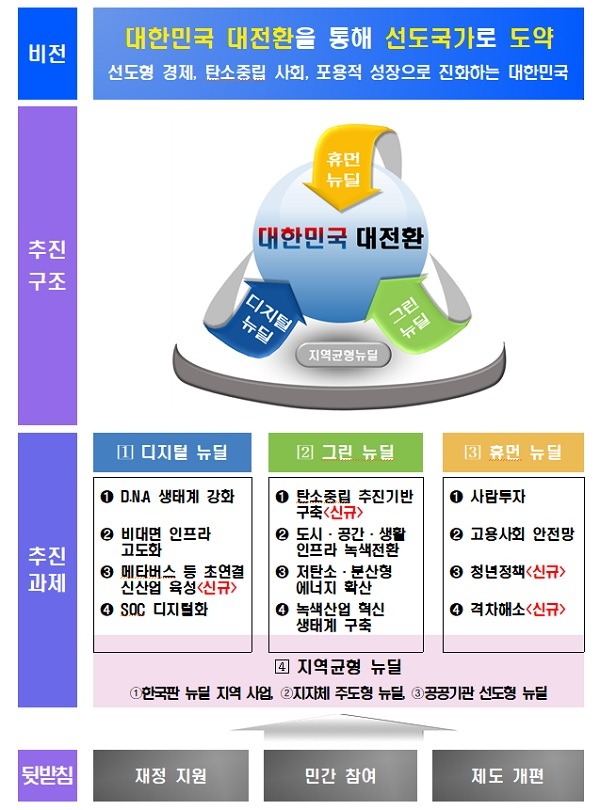 그린뉴딜에 탄소중립 추진기반 구축을 신설하는 한편, SW·의과학자·BIG3 등 첨단분야 인재를 양성하고 SW 중심대학을 2025년까지 64곳으로 추가 확대하기로 했다.