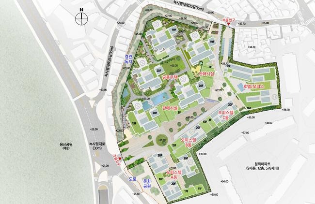 또한 주변 도시 맥락과 인접 지역의 재료와 색상을 반영한 다양한 주거유형의 공동주택과 한강의 물결을 반영한 오피스텔 디자인, 용산공원과 남산의 자연을 이어주는 수직정원 계획으로 기존의 획일적이고 단조로운 단지계획에서 벗어나 다양한 표정을 품으면서도 조화롭게 어울리는 복합단지를 계획하였다.