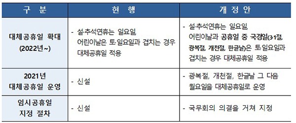 또한 이번 개정안에서는 필요시 정부가 국무회의 의결을 거쳐 임시공휴일을 지정할 수 있도록 ‘관공서의 공휴일에 관한 규정’ 내 절차를 명확히 했다.