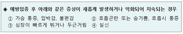 만약 39도 이상 고열이나 일반적으로 나타나는 이상반응의 증상이 일상생활을 방해하는 정도로 심해지거나 2일 이상 지속, 또는 알레르기 반응 등의 증상이 나타나면 의료기관을 방문해 진료를 받아야 한다.