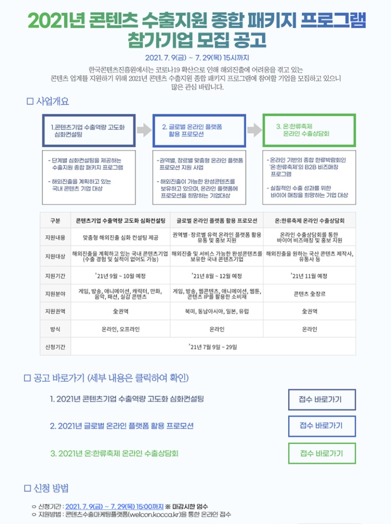 한국콘텐츠진흥원(이하 콘진원)은 포스트 코로나 시대 국내 콘텐츠 기업의 해외진출을 돕고자‘2021년 콘텐츠 수출지원 종합 패키지 프로그램’을 마련하여 오는 7월 29일까지 참가기업을 모집한다.