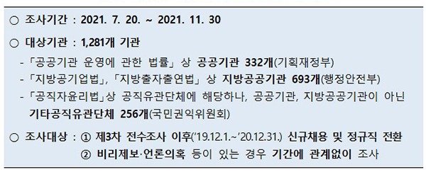 특히 이번 제4차 실태조사는 중앙행정기관과 지방자치단체가 실시하는 전수조사와 별도로 국회·언론 등을 통해 채용비위 의혹이 드러난 기관 등에 대한 추진단의 심층조사로 이뤄진다.