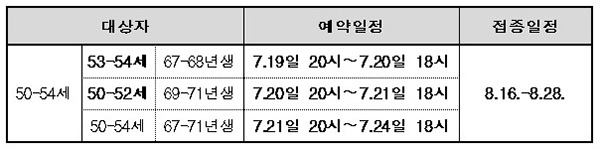 아울러 50~54세(1967년 1월 1일~1971년 12월 31일) 연령층에 대한 사전예약도 같은 날 저녁 8시부터 오는 24일 저녁 6시까지 6일동안 순차적으로 실시된다.