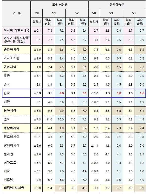 ADB는 한국 투자 및 수출 확대를 반영해 성장률 전망치를 올렸다. 디지털 경제에 대응한 민간 설비투자 증대, IT 장비 및 운송장비 수출 증대가 성장률을 끌어올릴 것으로 내다봤다. 여기에 이동 제한 완화, 고용상황 개선 등 민간수요 증대도 전망치 상향에 영향을 준 것으로 평가했다.