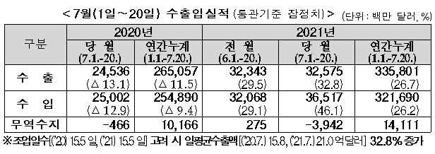 7월 들어 20일까지 수출이 지난해 같은 기간보다 30% 이상 늘었다.