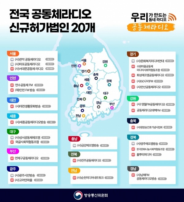 과기정통부와 방통위는 “이번 신규사업자 선정을 통해 공동체라디오방송이 지역사회 내 소통과 유대를 강화하는 매체로 자리매김하고 지역 공동체회복과 지역 사회 발전의 촉진제가 되기를 기대한다”고 말했다.