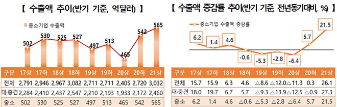 중소벤처기업부는 올해 상반기 중소기업 수출은 565억 달러로 지난해 동기보다 21.5% 증가했다고 21일 밝혔다.