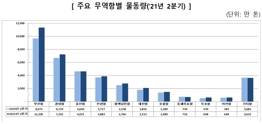 해양수산부는 2021년 2분기에 전국 무역항에서 처리한 항만 물동량이 총 3억 9,104만 톤으로, 전년 동기(3억 6,045만 톤) 대비 8.5% 증가하였다고 밝혔다.