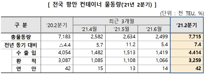 2021년 2분기 전국 항만의 컨테이너 처리 물동량은 수출입 물동량과 환적 물동량이 모두 증가하여 전년 동기(718만 TEU) 대비 7.4% 증가한 772만 TEU를 기록하였다.