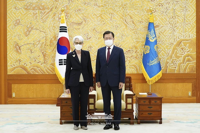 문 대통령은 셔먼 부장관의 취임 후 첫 방한을 환영하며, “셔먼 부장관은 국무부 요직을 두루 거치며 한반도와 동북아 정세에 정통한 베테랑 외교관으로 알고 있다. 기대가 크다”고 말했습니다.