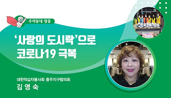 이처럼 김영숙 씨는 대한적십자봉사회 충주지구협의회 소속으로 코로나19 여파로 무료급식이 중단되어 어려움을 겪는 취약계층을 위해 사랑의 도시락으로 채충전을 돕고 있다.