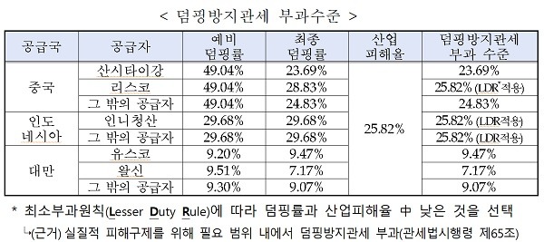 이와 함께, 덤핑률과 산업피해율을 비교해 둘 중 낮은 수준을 최종 덤핑방지관세 부과 수준으로 결정했고, 이에 따라 조사대상국 수출자별로 향후 5년간 7.17~25.82%의 덤핑방지관세율이 결정됐다.