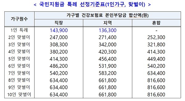 1인 가구의 경우 노인, 비경제활동인구가 많다는 특성을 반영해 연 소득 5000만원 이하에 지급하기로 했다. 이에 따른 건강보험료 본인부담금 합산액은 직장가입자와 지역가입자 각각 14만3900원, 13만6300원이다.