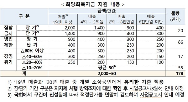 지난해 8월 16일부터 지난 6일까지 단 1회라도 집합금지 조치를 받은 소상공인 20만 명을 대상으로 피해규모 등을 반영해 최대 2000만원까지 지원한다.