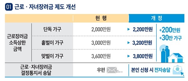 근로장려금 지급 대상이 되는 소득 상한은 200만원씩 인상한다. 맞벌이 가구의 소득 상한을 기존 3600만원에서 3800만원으로 올린다. 이렇게 바꾸면 총 30만 가구가 새로 근로장려금을 받게 된다.