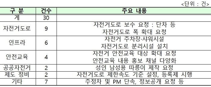 2021.4월~6월 3개월간 자출사 카페 내 서울시 제안게시판을 신설, 시범운영한 결과 자전거도로 보수, 자전거 주차장 확대, 안전교육 확대 등 총 30건의 제안이 접수됐다.