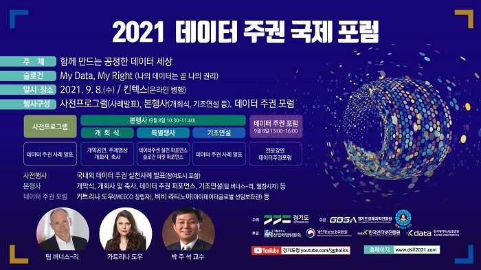 경기도는 지난해 2월 경기도의 세계 최초 데이터 배당 이후 도가 선도적으로 추진하고 있는 데이터 주권 정책을 더 발전시키고 개인의 데이터 주권을 널리 알리고자 ‘My Data My Right(나의 정보가 곧 나의 권리)’라는 슬로건으로 해외지자체들과 함께 데이터 주권 국제포럼을 개최한다.