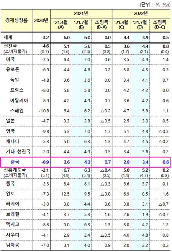 또 올해 세계경제 성장률 전망을 6.0%로 유지하되, 미국·한국 등 선진국의 성장전망은 상향조정(+0.5%p)하고, 인도·중국 등 개도국의 전망치는 하향조정(-0.4%p)했다.