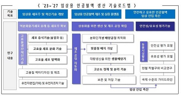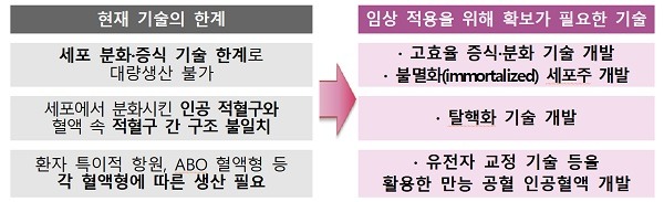 정부는 먼저, 인공혈액 세포 분화 및 증식 기술 개발을 지원한다. 지속적으로 인공 혈액세포(적혈구, 혈소판 등)를 생성할 수 있는 역분화줄기세포(iPSC) 유래 인공혈액 세포주를 개발하고, 역분화줄기세포에서 유도한 인공 적혈구 세포가 실제 적혈구의 특성을 갖춰 완전히 기능할 수 있도록 하는 탈핵화 기술도 개발한다.