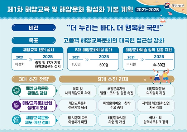 제1차 기본계획은 ‘더 누리는 바다, 더 행복한 국민’을 비전으로 해양교육문화에 대한 대국민 접근성 강화를 목표로 한다.