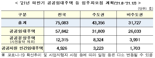 국토교통부는 올해 하반기 공공임대와 공공분양, 공공지원 민간임대주택 총 7만 5083가구에 대한 입주자를 모집한다고 3일 밝혔다.