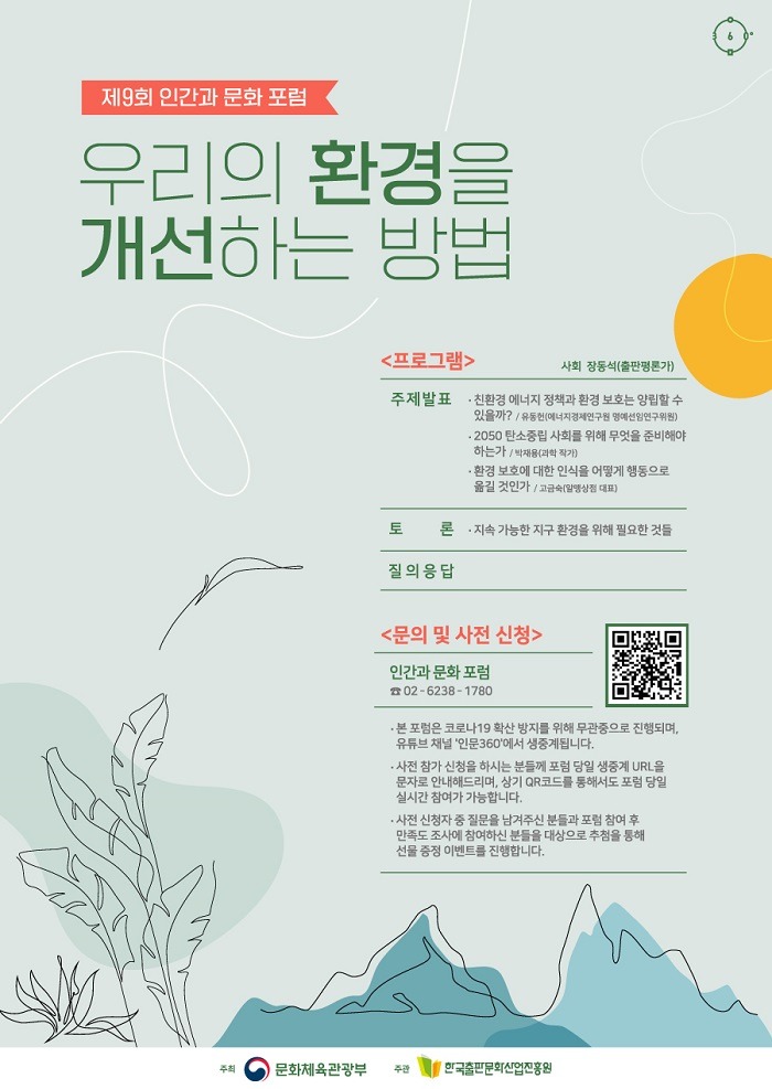 문화체육관광부(이하 문체부)는 한국출판문화산업진흥원(이하 출판진흥원)과 함께 8월 5일(목) 오후 2시, ‘우리의 환경을 개선하는 방법 – 지속 가능한 지구 환경을 위해 필요한 것들’을 주제로 아홉 번째 ‘인간과 문화 포럼’을 개최한다.
