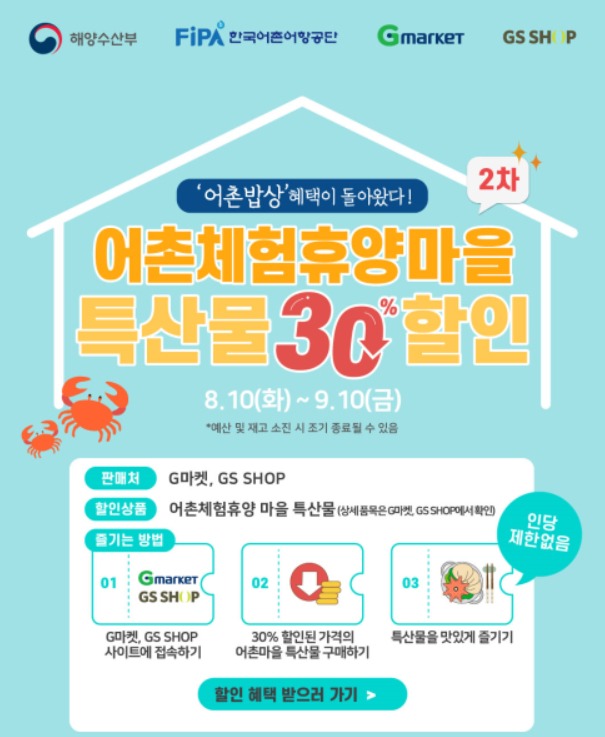 어촌마을 특산물 할인행사 소식을 개인 누리소통망(SNS) 등에 홍보하는 참가자를 대상으로 추첨을 통해 모바일상품권 등을 증정한다. 또 마을 특산물을 구매하고 후기를 남긴 참가자를 대상으로는 추첨을 통해 캠핑의자 등을 증정한다.