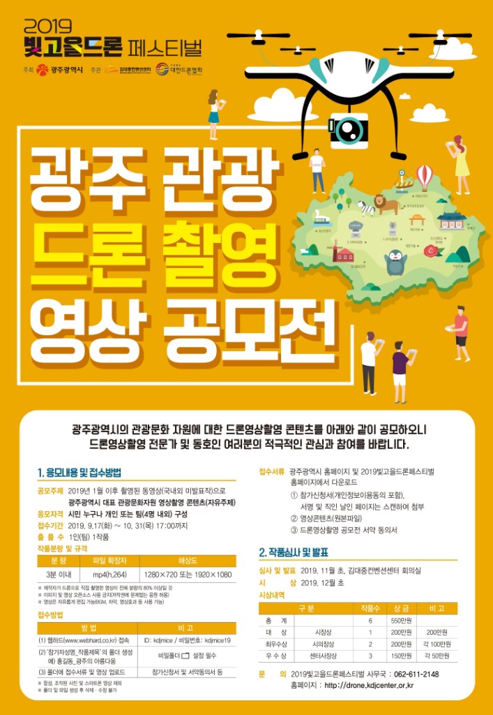 대회 참여는 드론에 관심 있는 전국 초·중·고교생, 대학생, 일반인 등 누구나 가능하다. 참가 접수는 ‘2019빛고을드론페스티벌’ 공식 홈페이지(http://drone.kdjcenter.or.kr)를 통해 14일까지 하면 된다.