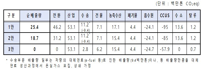 각각의 대안은 석탄발전 유무(전환), 전기수소차비율(수송), 건물 에너지 관리(건물), CCUS(탄소 포집·활용·저장 기술) 및 흡수원 확보량 등 핵심 감축수단을 달리 적용함에 따라 (1안)2540만톤, (2안)1870만톤, (3안)0(net-zero)의 2050년 온실가스 순배출량을 전망하고 있다.