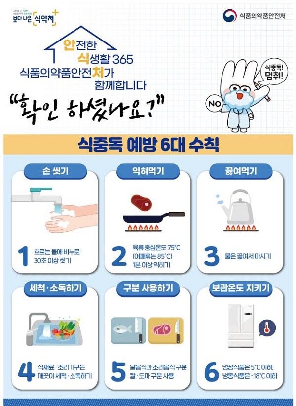 기온이 상승하는 여름철을 맞아 식중독 등 식품안전사고 예방을 위해서는 손씻기, 익혀먹기, 끓여먹기, 세척·소독하기, 칼·도마 등 구분 사용하기, 보관온도 지키기 등 ‘식중독 예방 6대 수칙’을 준수하는 것이 중요하다.