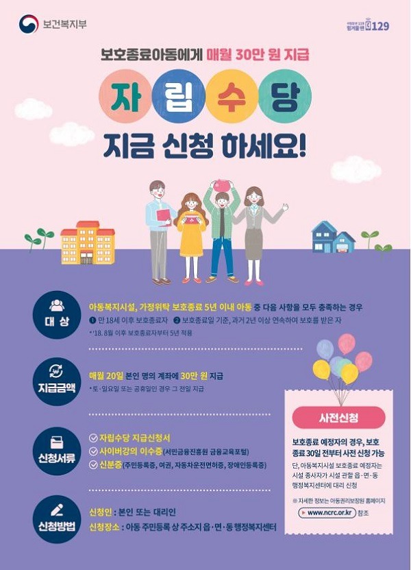 제도 안내, 신청방법·서류 등 자세한 정보는 아동권리보장원 누리집(http://www.ncrc.or.kr), 자립정보ON(애플리케이션)을 통해 확인할 수 있다.